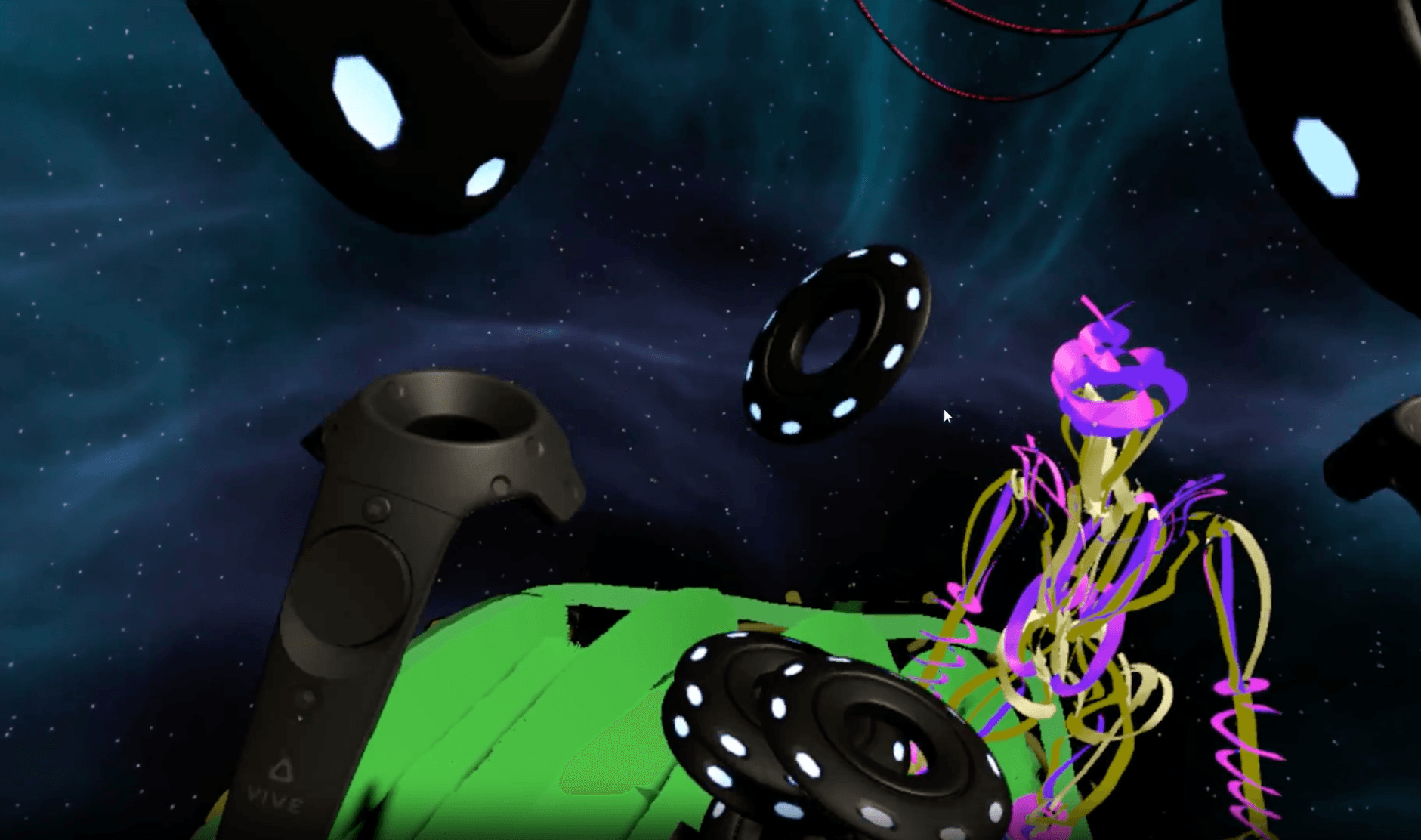 Aside from the frisbee, all of the items in the environment were created using Google's Tilt Brush VR application. We were delighted at how simple it was to export designs from Tilt Brush and import them into Unity. Max was even able to rig up the human spaghetti figure and add some animations. The pedestals for the frisbees and the floating coils were some of my creations. 💁♂️
